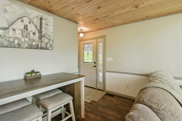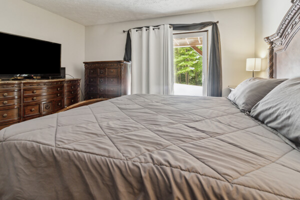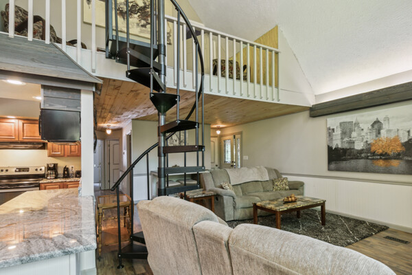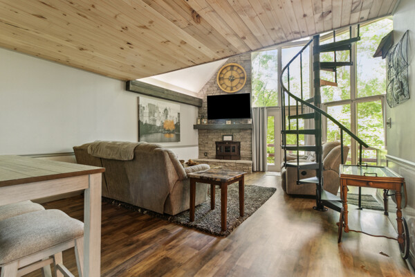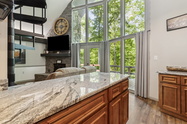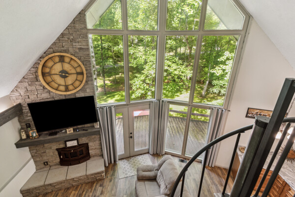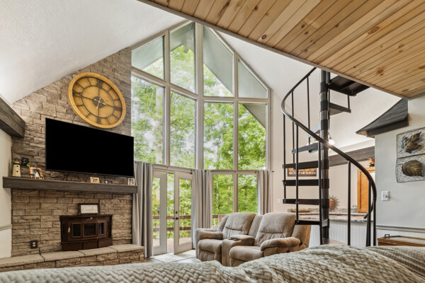 Awake to the soft glow of morning light filtering through the trees, and bask in the golden hues of sunset painting the sky in the evenings. The expansive windows not only bring the outdoors in but also create a bright and airy atmosphere throughout the cabin.